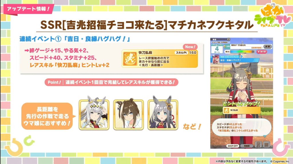 長距離チャンミが終わったばかりですが、新しい金スキルが入手できるうえに、連続イベントが1回で完結するのがポイント。